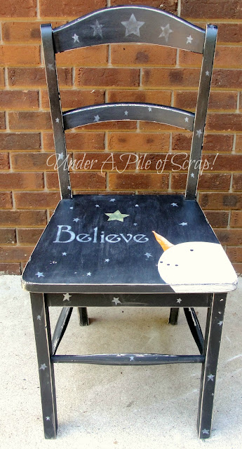 So there it was, literally in the middle of July, and I was painting up a snowman chair from a chair I found at a garage sale. I figured if Miss Mustard Seed can do Easter decor at Halloween and Thanksgiving for Easter, then I can do Christmas in July. It's not unheard of. The TV stations do it all the time. I've seen Christmas in July shows on the channel my daughter watches. See where I got the inspiration for this snowman chair from HERE.